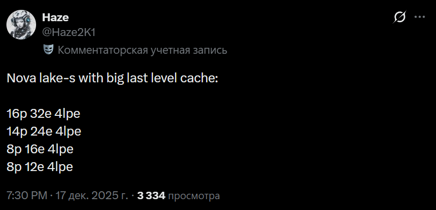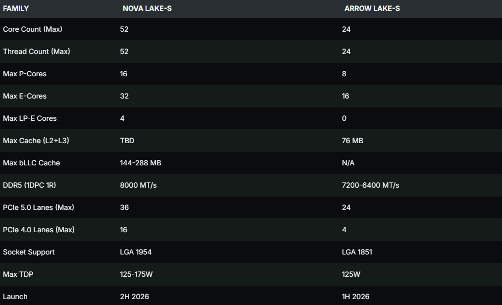 - Двухчиплетные решения Nova Lake-S получат конфигурации 52 ядра (16+32+4) и 42 ядра (14+24+4) с объёмом кэша bLLC до 288 МБ