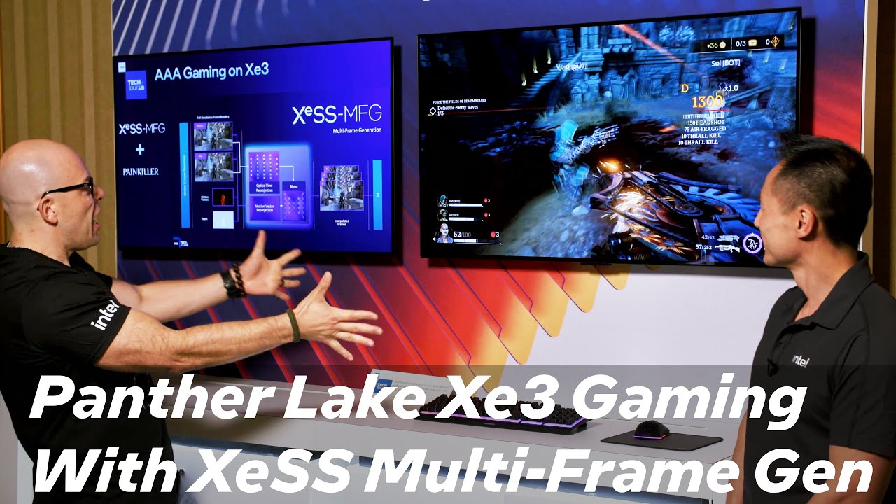 Основным нововведением станет система Multi-Frame Generation (MFG), предоставляющая выбор между режимами генерации кадров 2×, 3× или 4× через панель управления Intel Graphics Software. Аналогично технологии DLSS от NVIDIA, искусственный интеллект создаёт промежуточные кадры для повышения плавности изображения. Демонстрация XeSS 3 на чипе Panther Lake с 12 ядрами Xe показала следующие результаты: