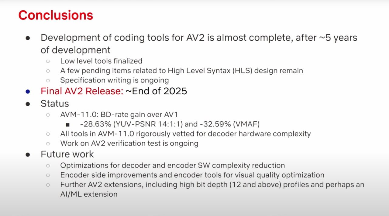 После релиза создатели продолжат совершенствование кодека: упростят работу кодеков, улучшат качество изображения и могут добавить дополнительные функции. В числе перспективных направлений — поддержка 12-битной глубины цвета, а также интеграция решений на основе искусственного интеллекта.